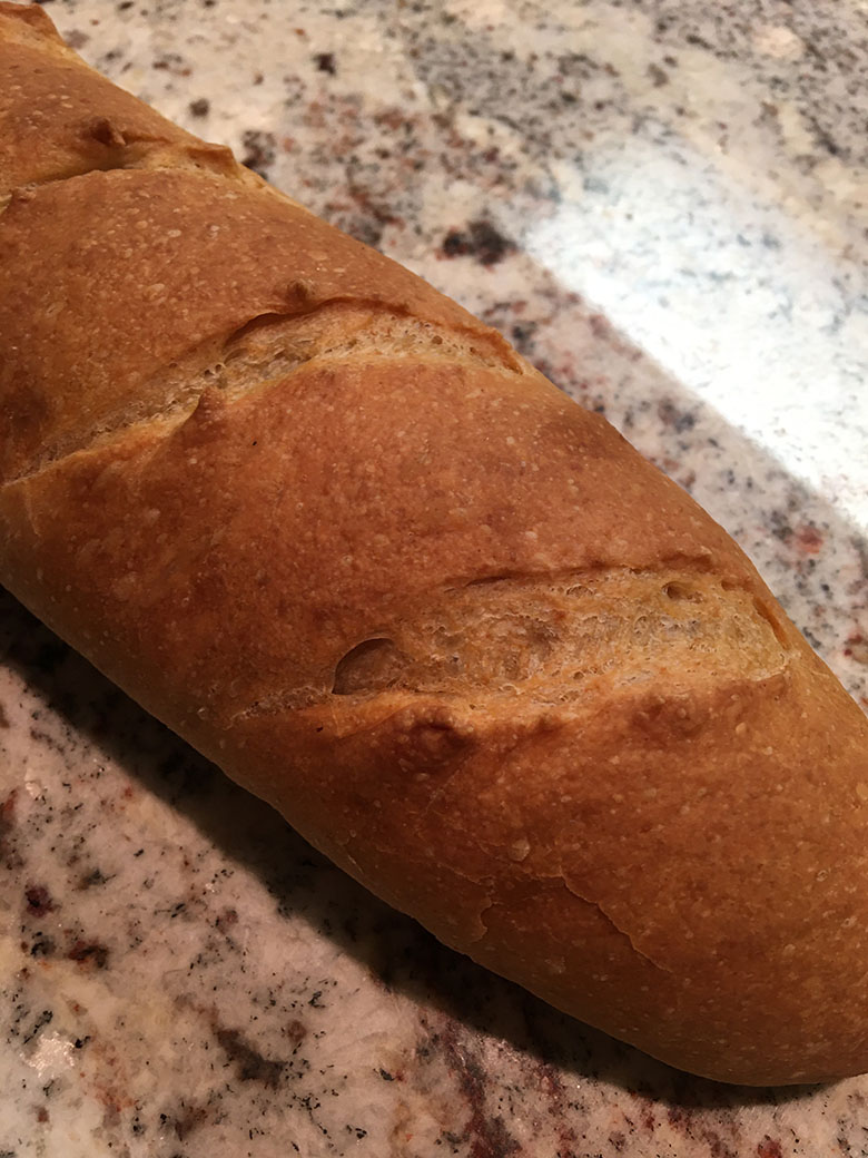 Step 7. Cover and let rise for about 2-4 hours. Preheat the oven to 400 degrees. Make slits on the top of the loaf to allow expansion during baking, a razer blade works well for this. Spray the surface lightly with water. To create some steam in the oven spray water in the oven once during the first five minutes of baking. Bake for 30 minutes, until the outer crust is a dark golden brown.