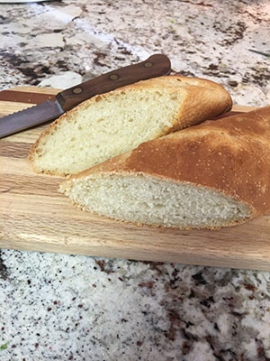Step 6. Now you are ready to shape the dough as you wish. This dough is wonderful as french bread, hamburger buns or pizza dough. To create a french bread style loaf, start by flipping the ball over so the top side is down. Gently lift the dough to stretch the dough into a rectangle. Lay the dough back down and fold the ends in to the middle. Stretch the bottom so it is wider than the top. Starting at the top roll the dough towards you, then gently push with the flat part on your hand to create some tension as you roll. Repeat to shape. pinch the seam and lay in the pan you will use to raise and bake the loaf.