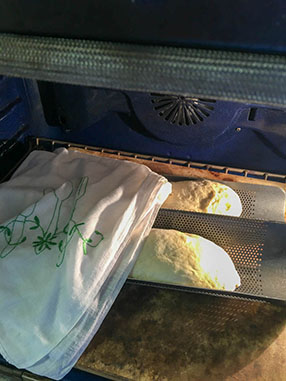 Step 3. Let the dough rest and ferment in a warm place. The best place I have found for this is my oven with just the oven light on. About every hour, stretch and turn the dough. With a wet hand reach under the dough, lift and stretch. Turning the bowl a quarter turn at a time, repeat.